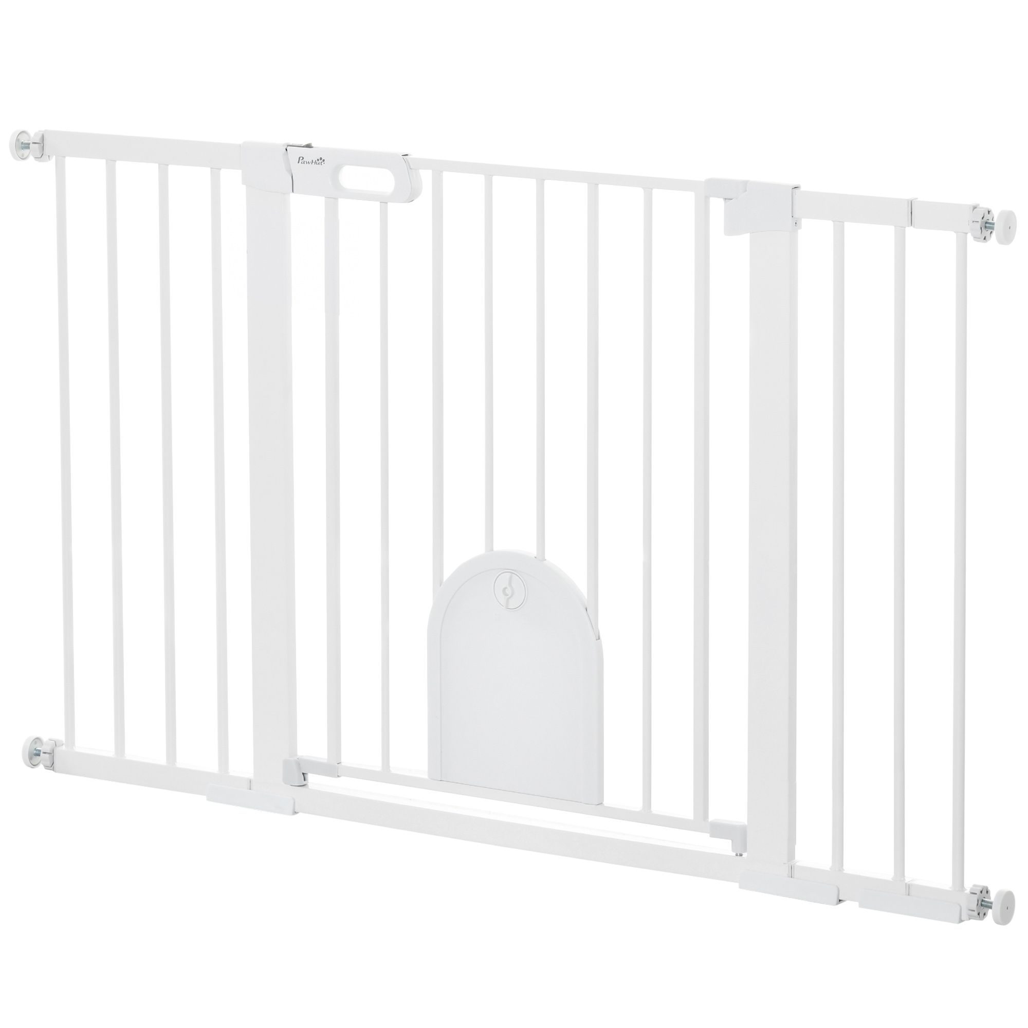 Keep pets away from rooms when required with the Pawhut dog gates with walk through door. Made from metal with lead-free treated surface for strength and safety. Ranges from 29.5" to 51.6"(75 - 131 cm) wide, allowing it to fit into different sized spaces with ease. Slide and lift, the handle is easy to open, allowing you to pass through quickly without your pet escaping for security. Double locking mechanism ensures your pet secured in a place to provide maximum safety.